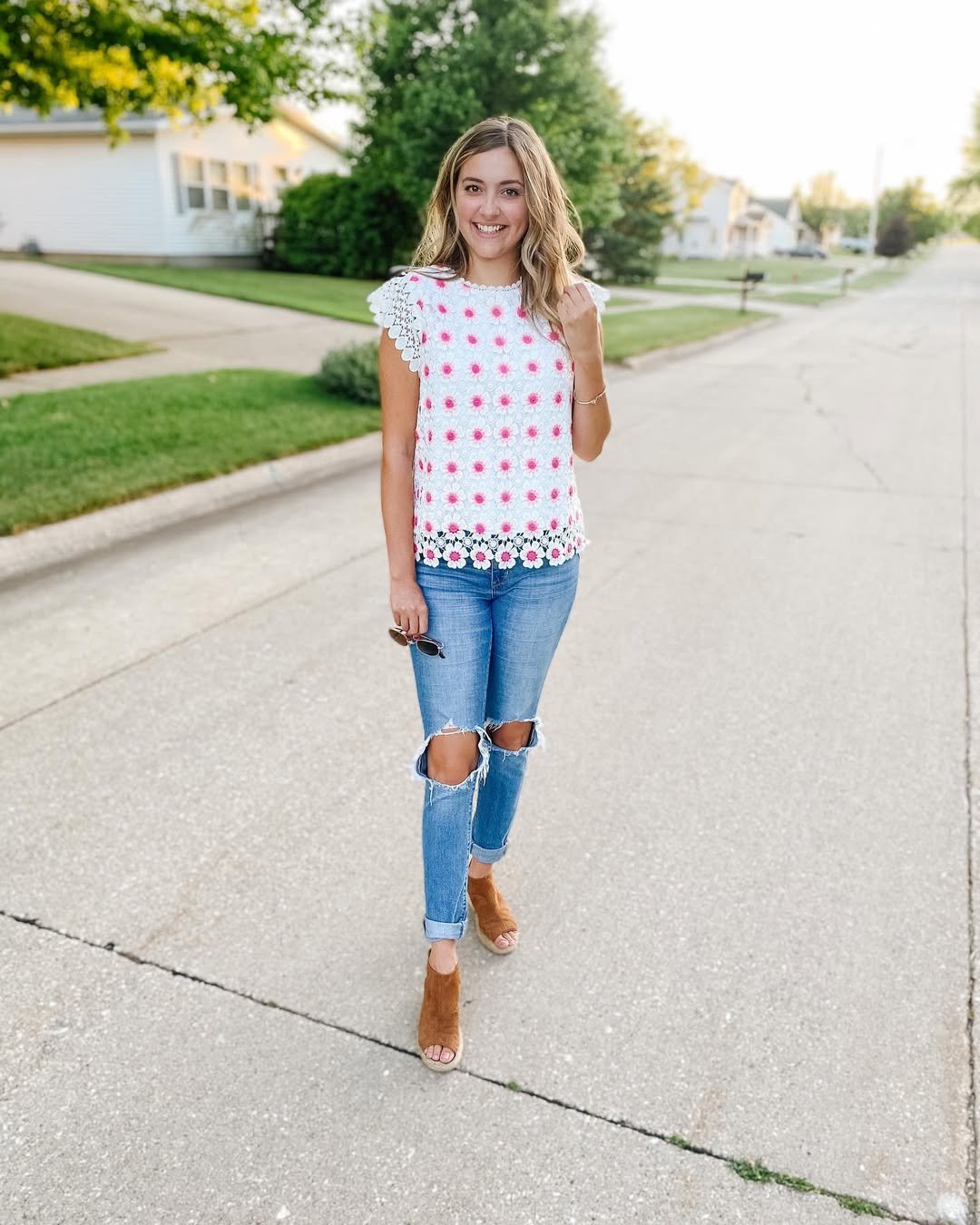 Some workdays call for tailoring, and some call for a little breathing room. This look lands right in that sweet spot. The lace floral top adds a soft, feminine touch while the distressed jeans keep the whole outfit relaxed and approachable.