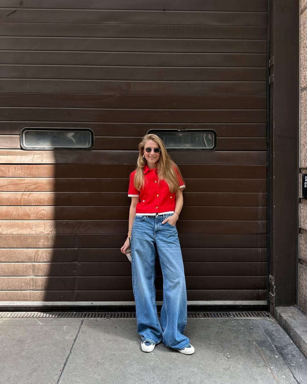 Sometimes all you need is one bold piece to wake up a simple outfit. The red polo-style top instantly energizes this relaxed denim look, creating an easy balance between casual and put-together.