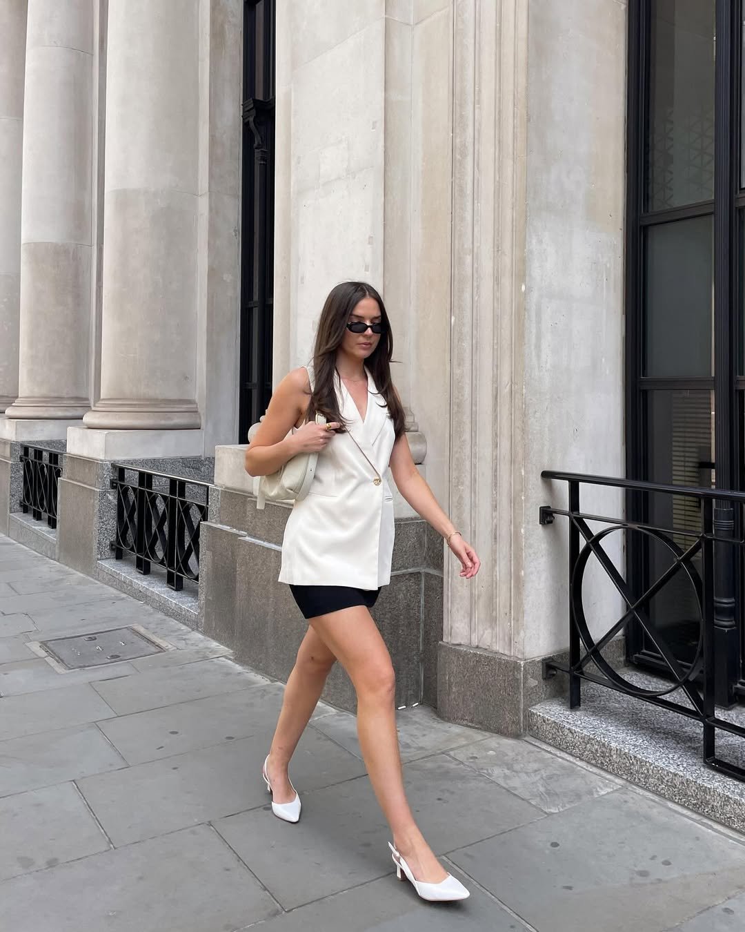 This outfit captures that sleek city energy perfectly. The sleeveless blazer layered over a fitted mini creates a silhouette that feels modern, confident, and effortlessly stylish.
