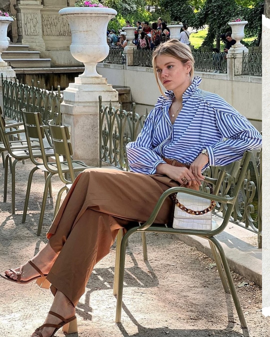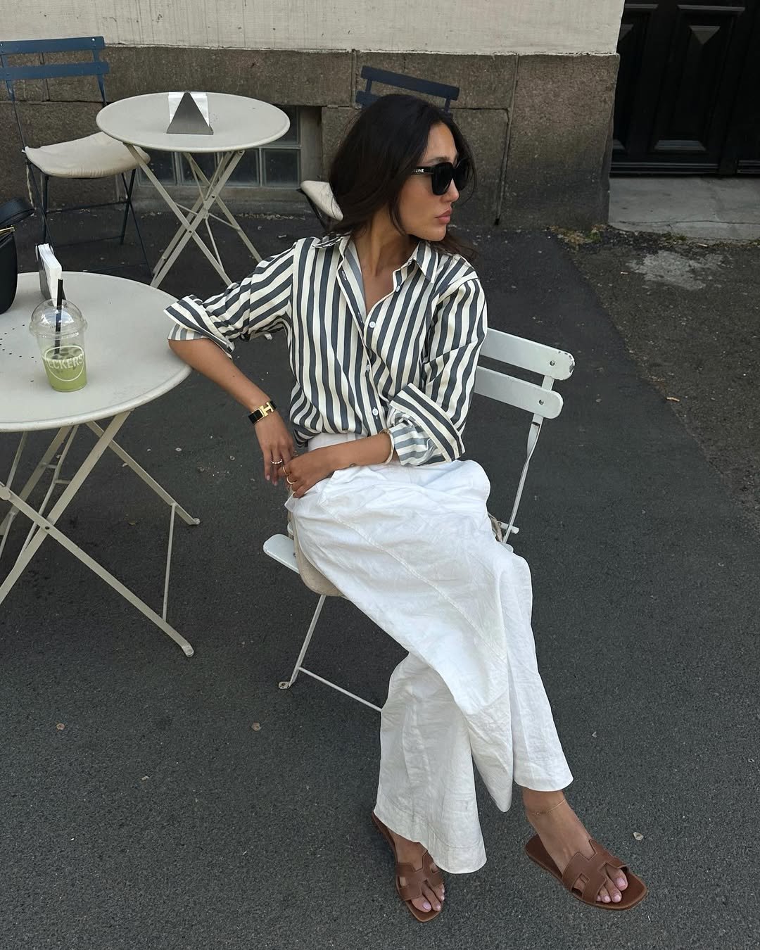 There’s something about a striped button-down that always reads polished, even when the outfit feels wonderfully relaxed. Here, the oversized shirt tucked into flowing white trousers creates that breezy summer work uniform that looks both smart and comfortable.
