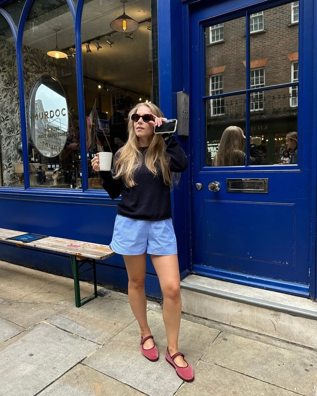 This outfit captures that relaxed morning rhythm before the workday fully begins. A simple black sweater paired with striped shorts feels easy and comfortable while still looking intentional.