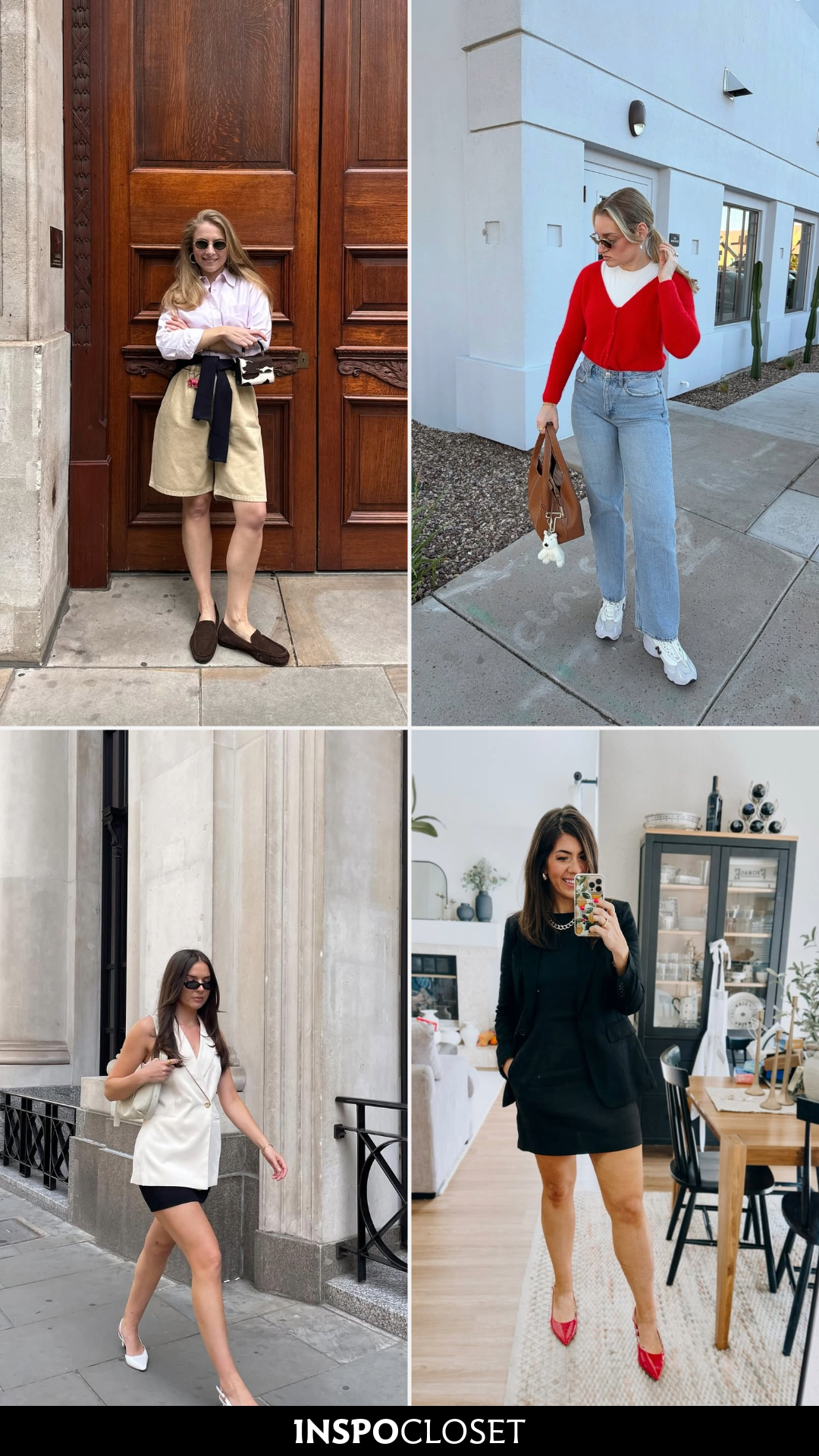 A crisp button-down and tailored shorts bring a playful spin to traditional workwear. The outfit feels sharp and clean, especially with the sweater tied at the waist adding that collegiate charm.