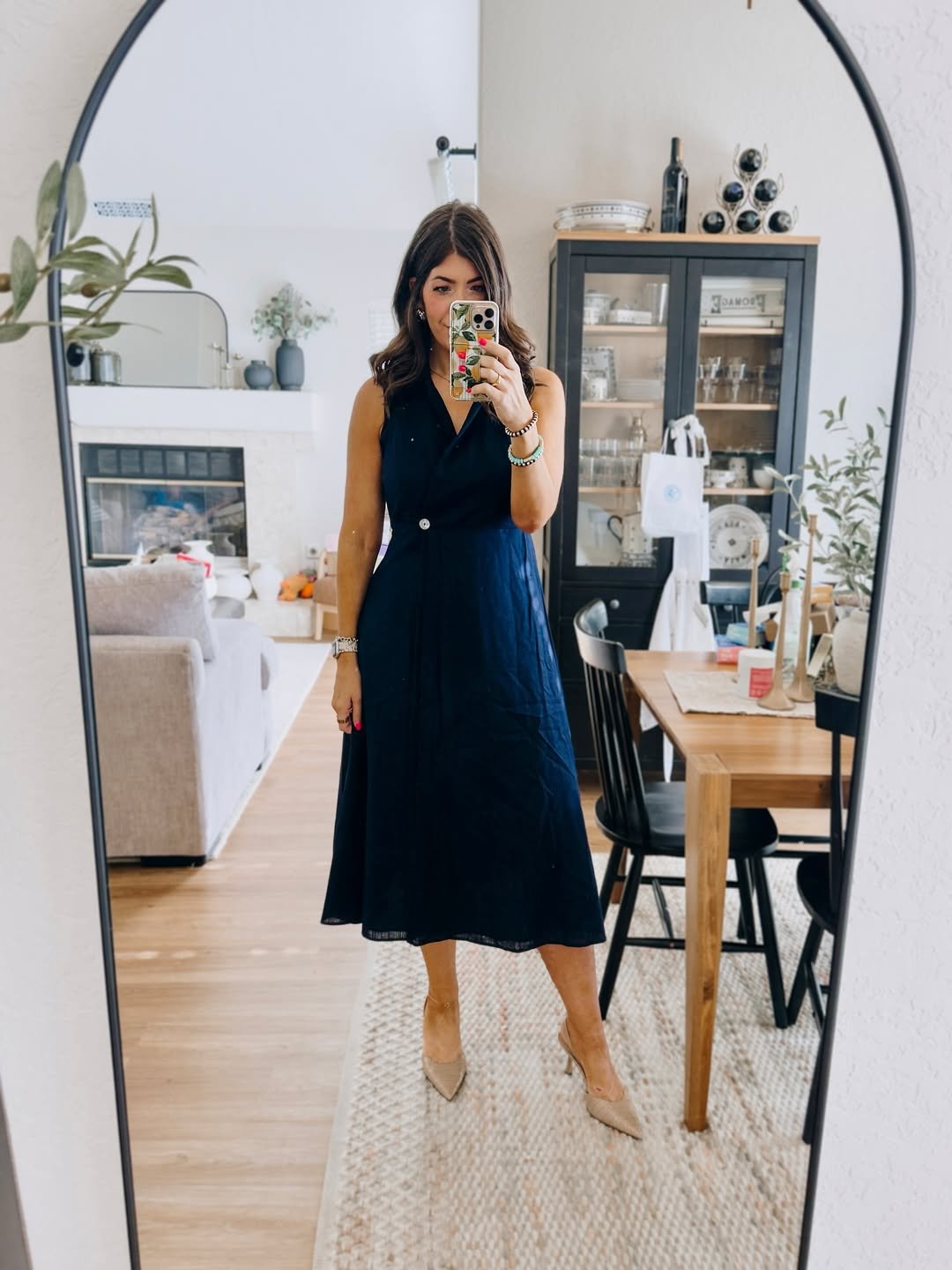 Paired with nude heels and simple jewelry, the outfit feels polished but approachable. It’s the kind of dress you can rely on for days when you want to look put together without overthinking it.