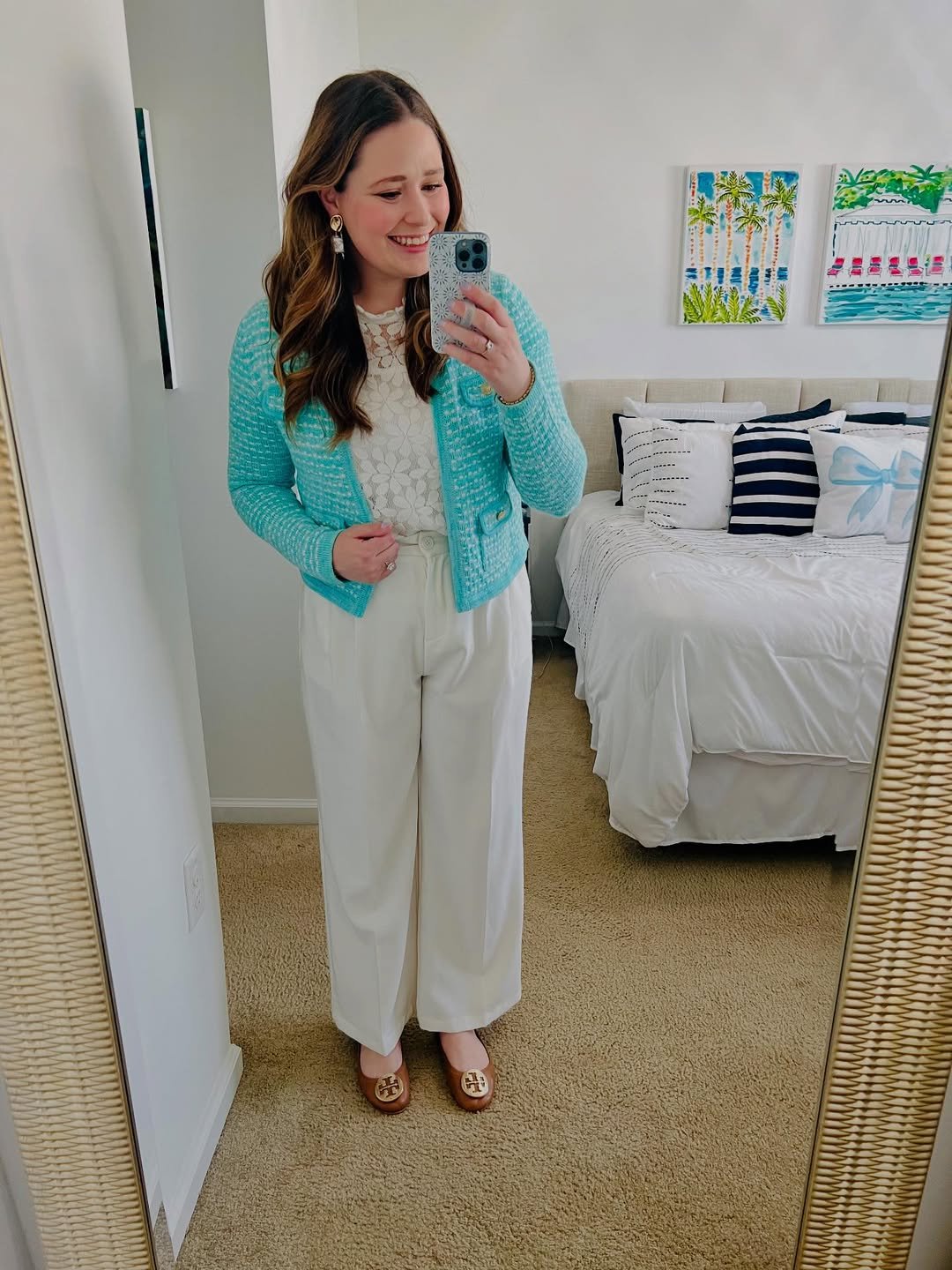 Soft mint tones bring a refreshing feel to this look. The textured cardigan layered over a delicate lace top adds dimension while still keeping the palette light and airy.