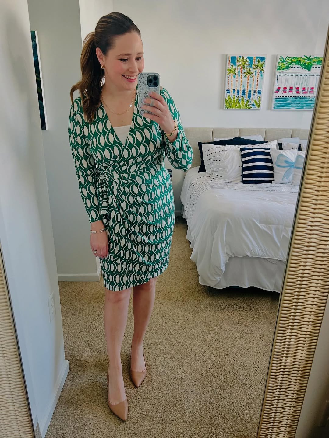 There’s something about a wrap dress that always feels flattering and effortless. This green geometric print version brings a modern twist, with a silhouette that feels both structured and easy to wear.
