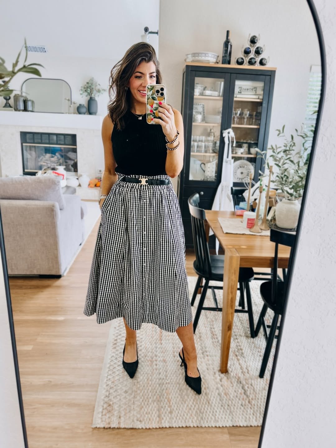 There’s something timeless about a black top and gingham skirt. The fitted sleeveless knit keeps the look sleek, while the full skirt brings that soft, classic charm that feels straight out of a Parisian street style moment.