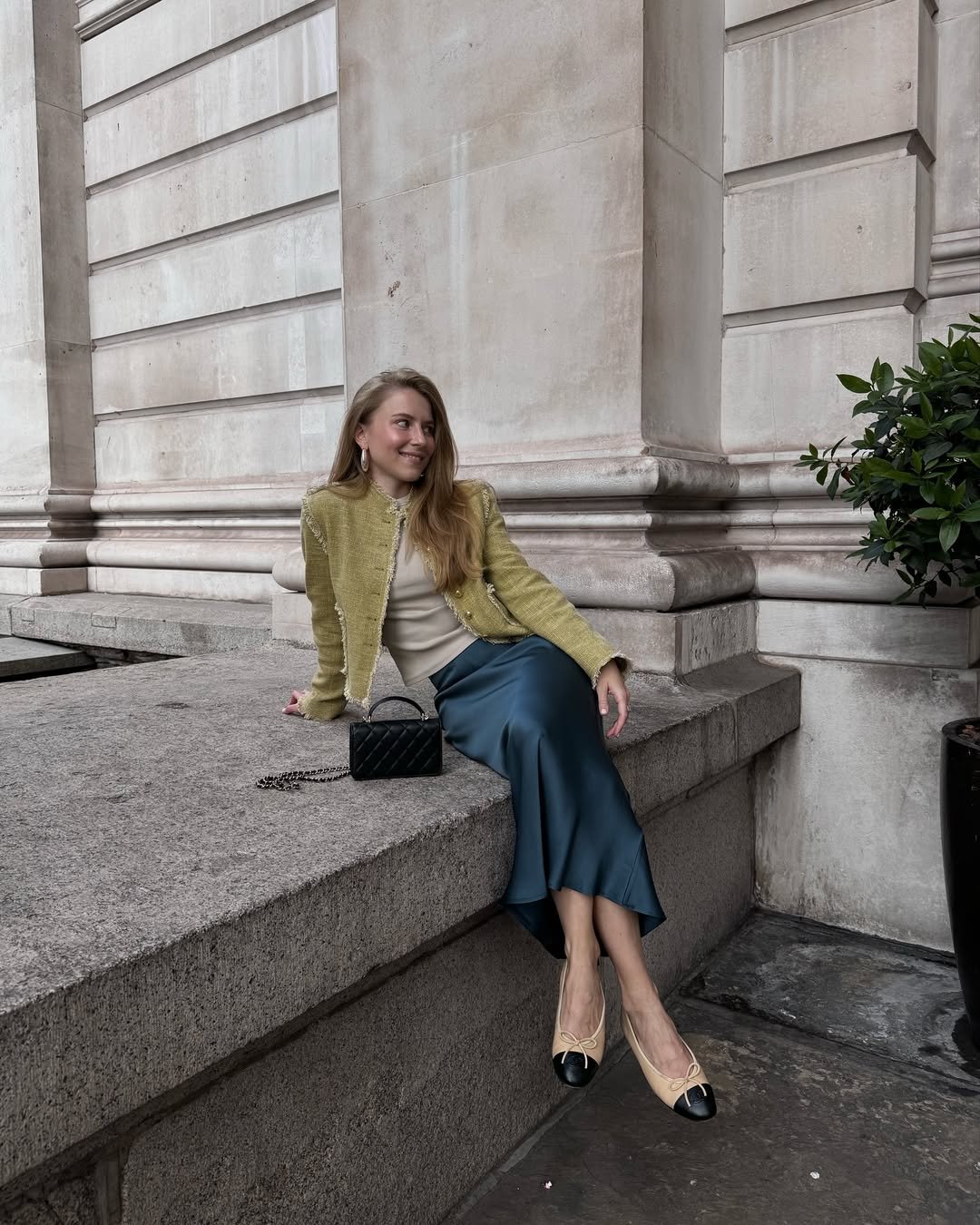 Ballet flats and a quilted mini bag complete the outfit in the most classic way. It’s refined without feeling stiff, the kind of style that makes even a regular office morning feel a little more sophisticated.