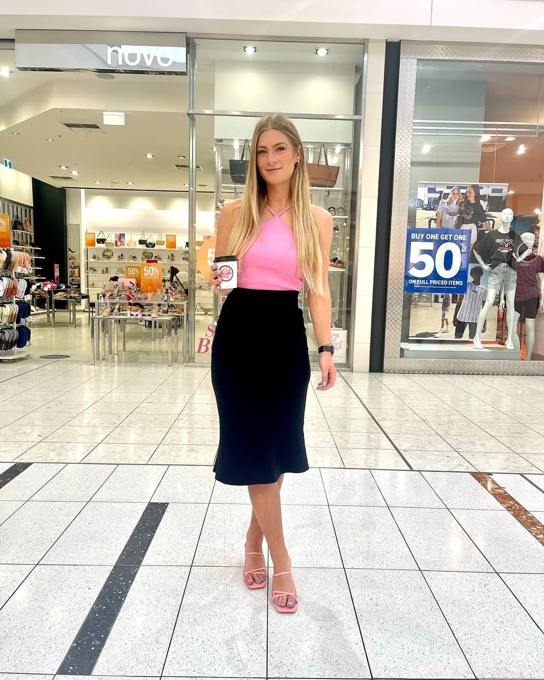 This look feels like the perfect blend of casual glam and everyday style. The soft pink halter top paired with the sleek black midi skirt creates a flattering silhouette that feels both feminine and modern.