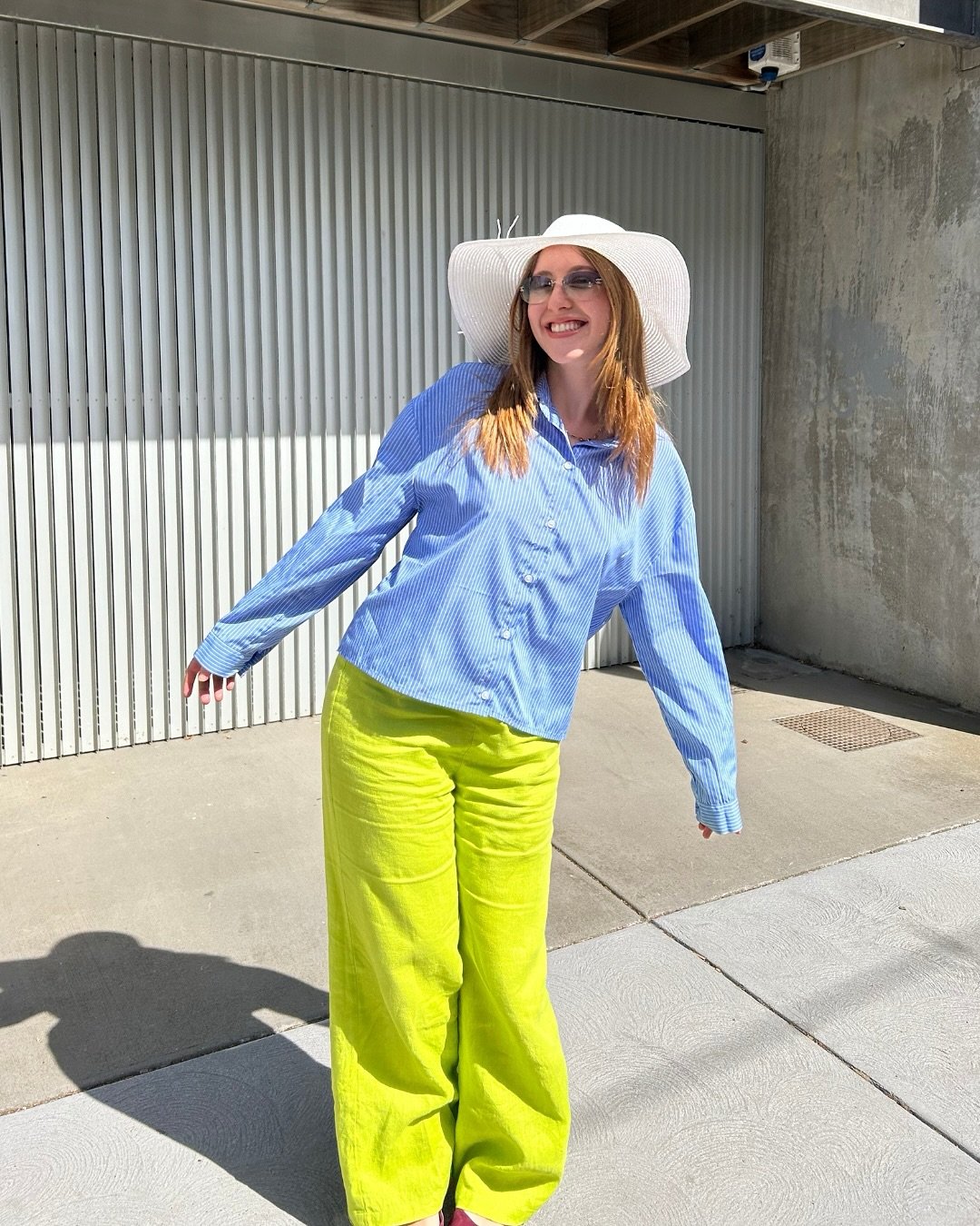 This look leans fully into fun. The crisp blue striped shirt paired with those bold lime trousers creates a color combination that shouldn’t work… but somehow absolutely does. Add the oversized white sun hat and suddenly the whole outfit feels like a summer statement.