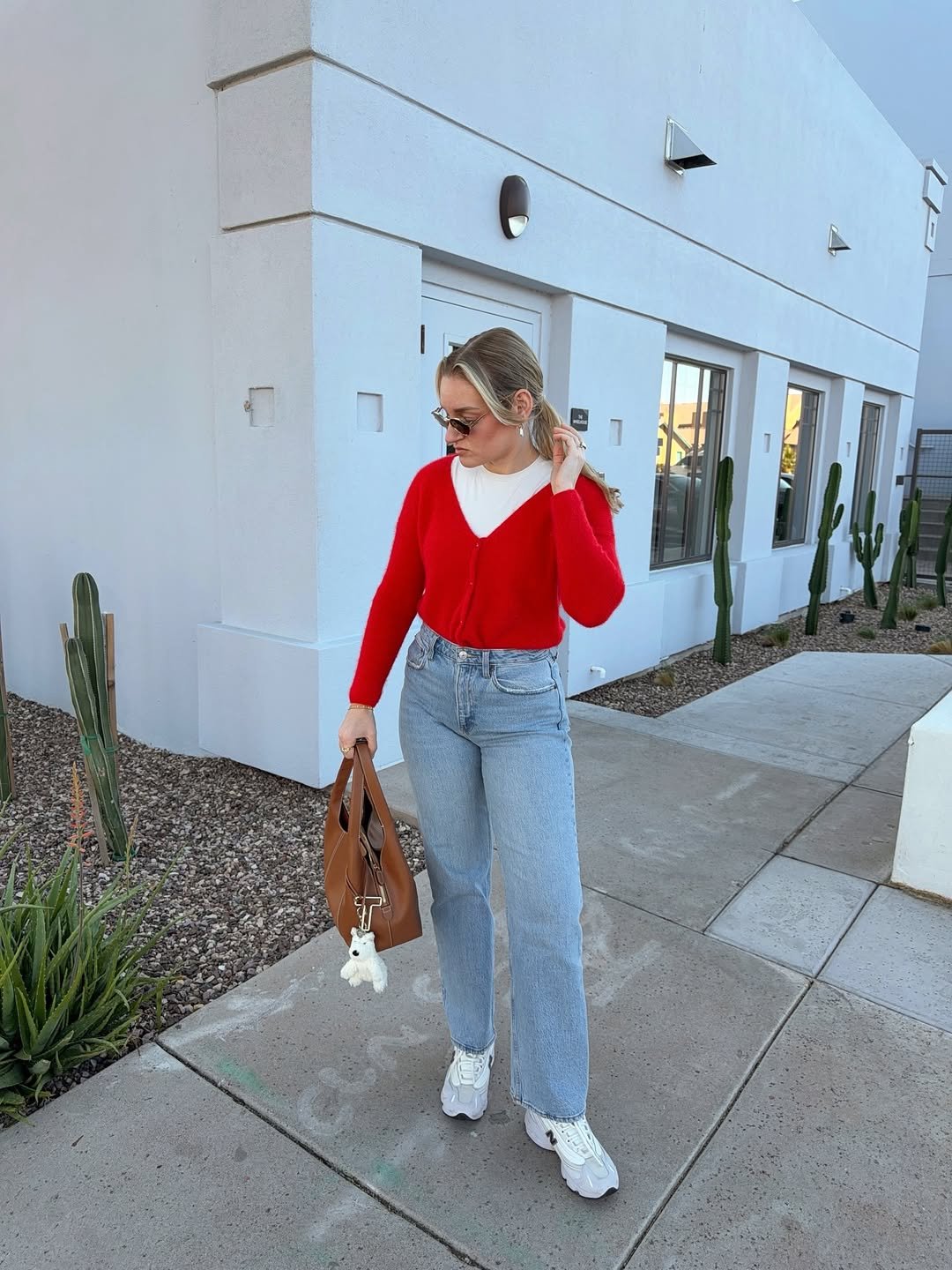 Sometimes the best outfits are the simplest ones. A bright red cardigan paired with classic straight-leg denim creates that easy, everyday look that always feels comfortable and stylish.
