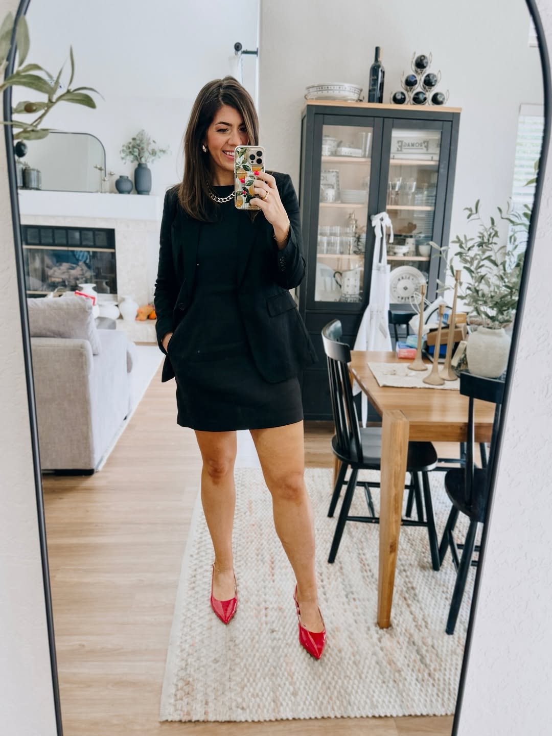 But the red heels are what make the outfit sing. That pop of color adds just the right amount of drama, turning a simple look into something memorable.