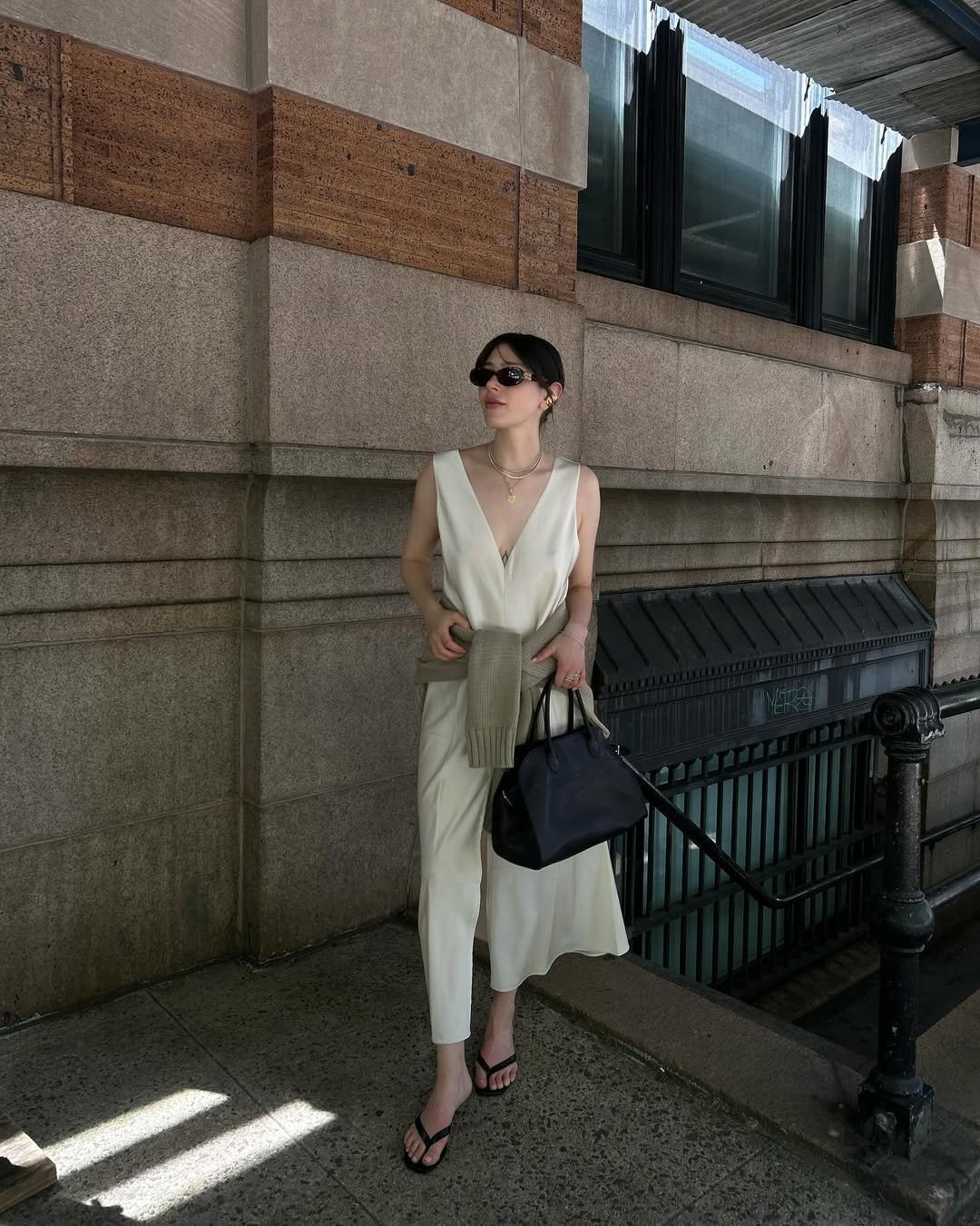 Light neutrals always feel right in the summer office rotation. This cream slip dress paired with a casually draped sweater creates a look that feels thoughtful but never overstyled.
