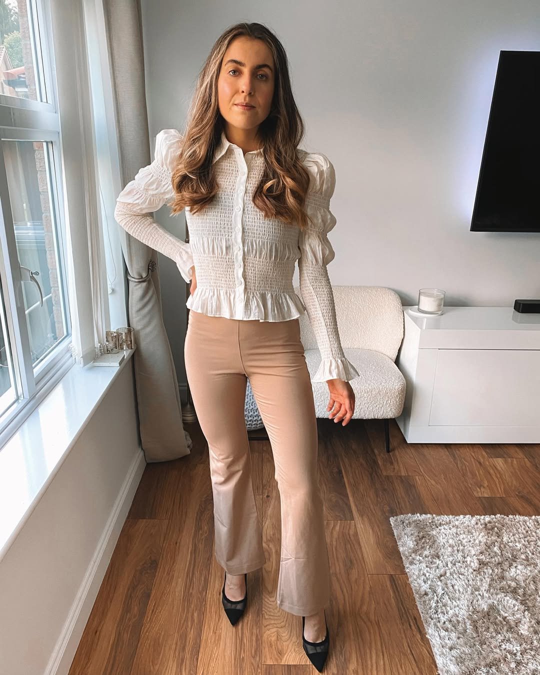 There’s something about a crisp white blouse that instantly makes an outfit feel polished. Here, the textured top with subtle puff sleeves brings a romantic touch, while the tailored beige trousers keep the look grounded and quietly sophisticated.
