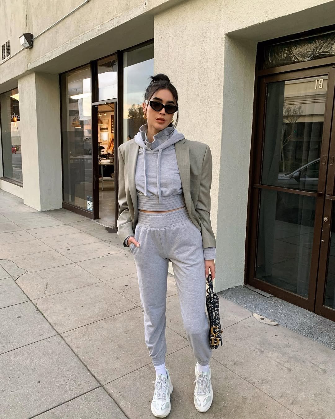A structured blazer over a cropped grey hoodie and matching joggers is the kind of styling trick that never fails. The tailored lines of the jacket sharpen the softness of the sweats, while sleek sneakers keep it modern.
