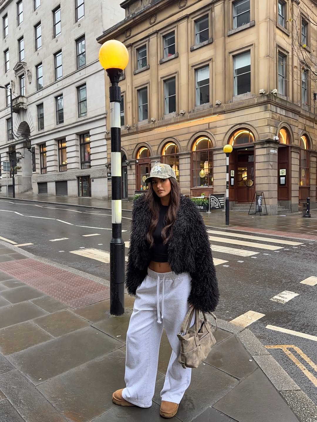 Grey sweatpants meet a shaggy black jacket and a camo cap. Suddenly, your basics feel layered and directional. The wide-leg fit gives the whole look movement, especially against that rainy city backdrop.