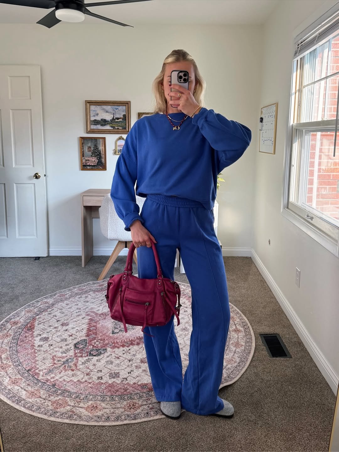 A bold blue set with a sleek wide-leg silhouette instantly shifts sweatpants into statement territory. The matching sweatshirt tucked just slightly at the waist keeps the proportions clean, while that deep red bag adds the perfect unexpected contrast.