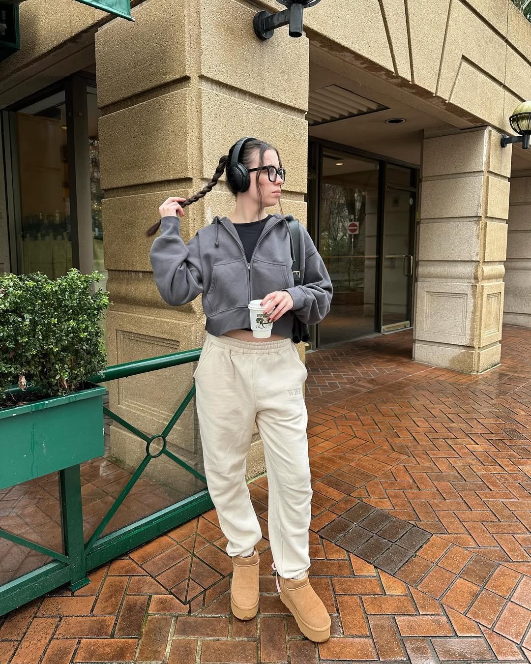 Cropped grey zip-up, cream joggers, and chunky boots create a balanced play on proportion. The headphones and sleek glasses add personality, giving the outfit a slightly editorial edge.