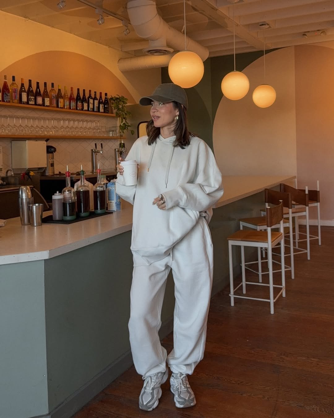 Soft cream on cream, styled against that warm café glow, feels like a quiet flex. The oversized hoodie drapes just right over relaxed joggers, and the neutral sneakers keep everything grounded. Even the baseball cap adds that low-key cool girl touch without interrupting the palette.