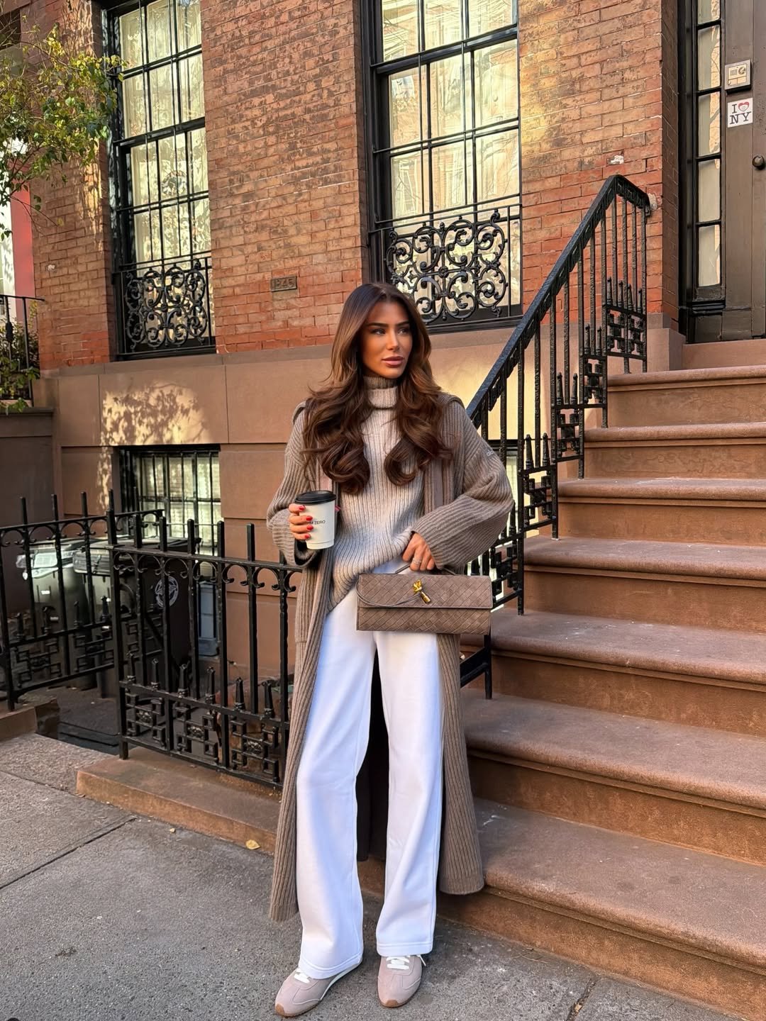 A long ribbed cardigan over a chunky knit and crisp white wide-leg sweats feels timeless against that brownstone backdrop. The quilted clutch and soft sneakers make the whole look feel curated rather than casual.