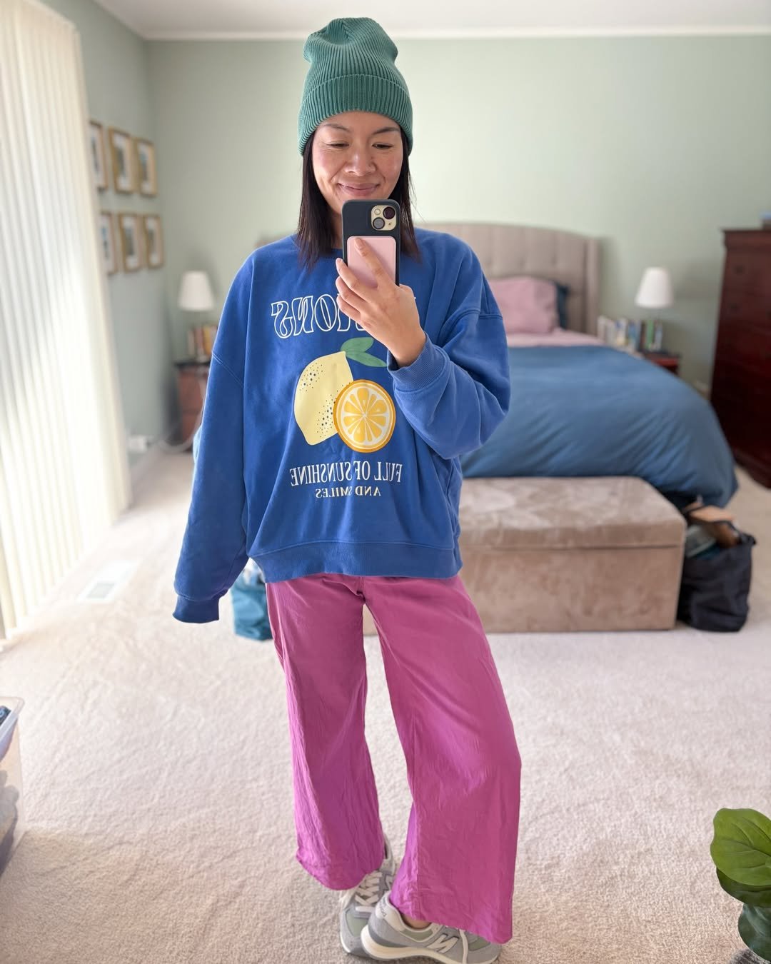 A cobalt graphic sweatshirt tucked into pink wide-leg pants is the kind of combo that makes you smile. The green beanie adds an unexpected twist that ties it all together.