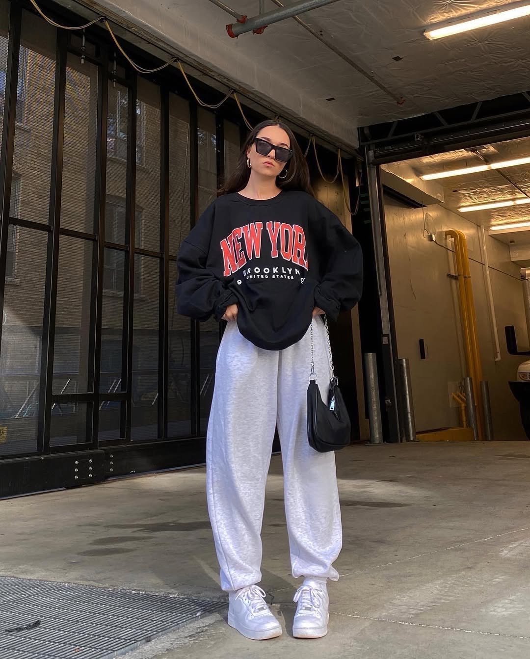 An oversized New York sweatshirt paired with slouchy grey sweats feels nostalgic in the best way. The black shoulder bag and sleek sunglasses add a bit of polish, keeping the look from veering too casual.
