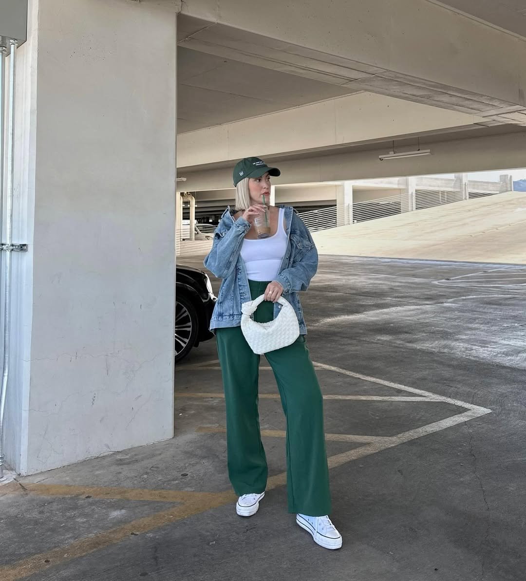 Emerald wide-leg sweats paired with a white tank and oversized denim jacket feel fresh and confident. The baseball cap and woven bag bring in texture, while crisp white sneakers keep the look clean.