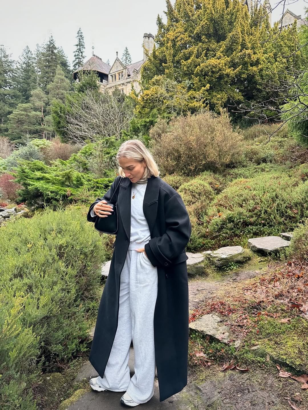 A sweeping black coat layered over a grey sweatsuit feels timeless against that lush garden backdrop. The long lines of the coat contrast beautifully with the relaxed drape of the pants.