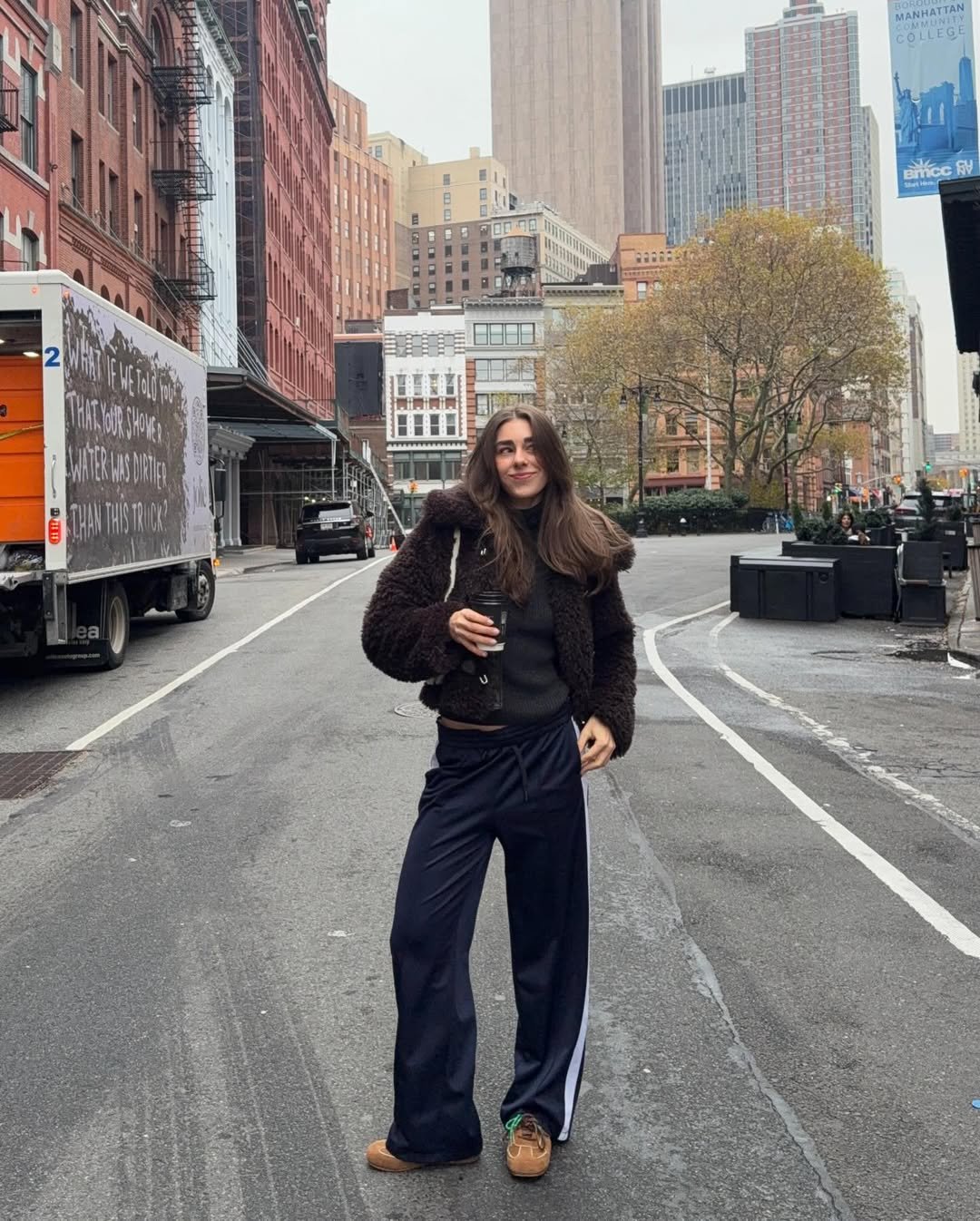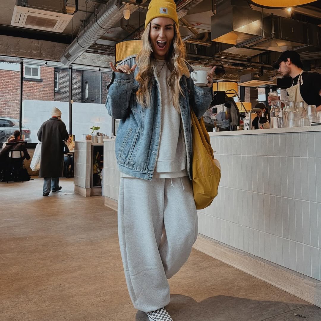 Dark wide-leg sweats paired with a textured brown jacket and classic boots. Add a coffee cup and a city street, and you’ve got instant downtown energy.