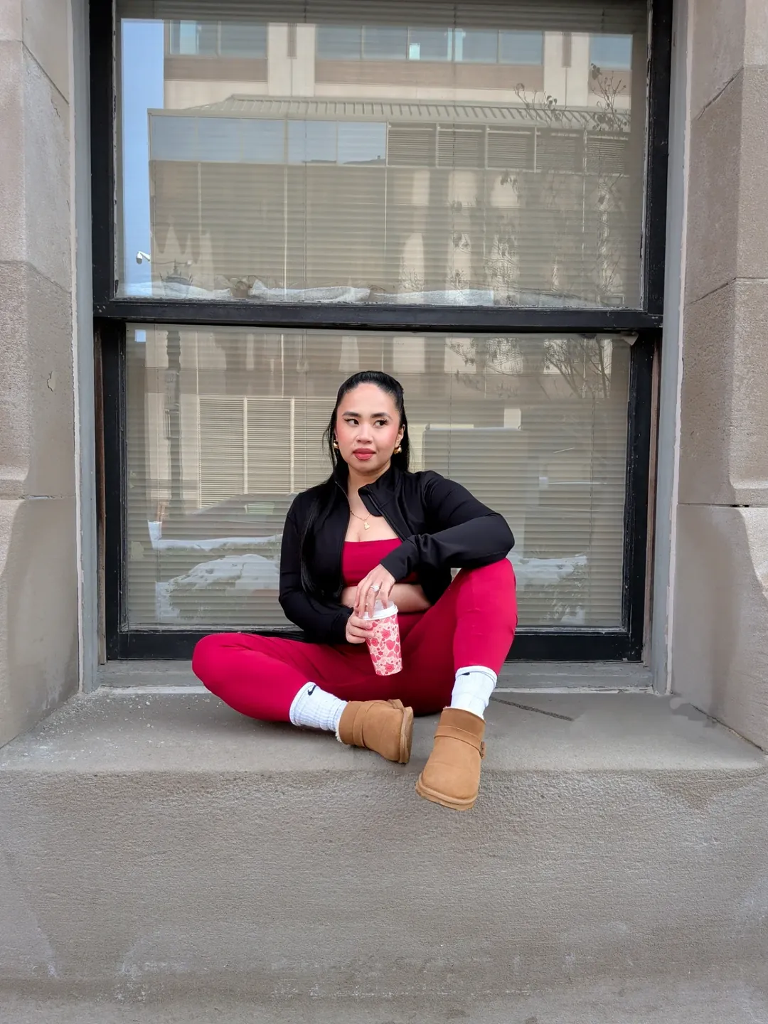 Red sweats, a matching crop, and a sleek black zip-up layered on top. It’s giving coffee run energy, but make it intentional. The UGG boots and white crew socks soften the bold color story, turning what could feel loud into something cozy and cool.