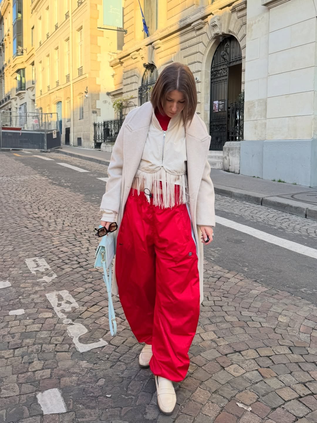 Red track pants on cobblestone streets, paired with a soft ivory coat and fringe detail, create that high-low magic we all chase. The tailored outer layer tempers the sporty base, and those cream loafers make it feel city-ready instead of gym-bound.