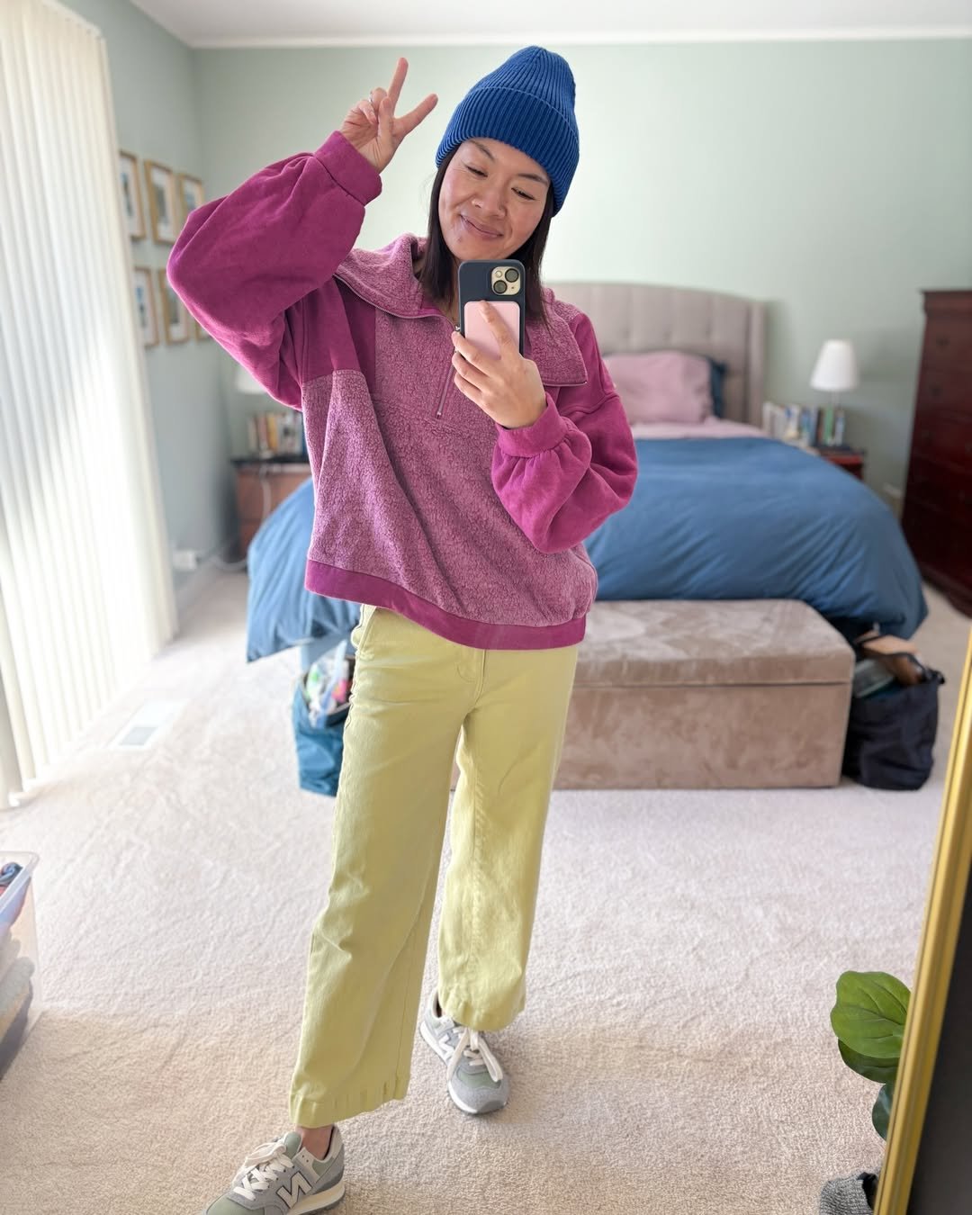 A cozy magenta fleece with light chartreuse pants and a bright beanie. It’s cheerful without being chaotic, especially grounded by neutral sneakers.