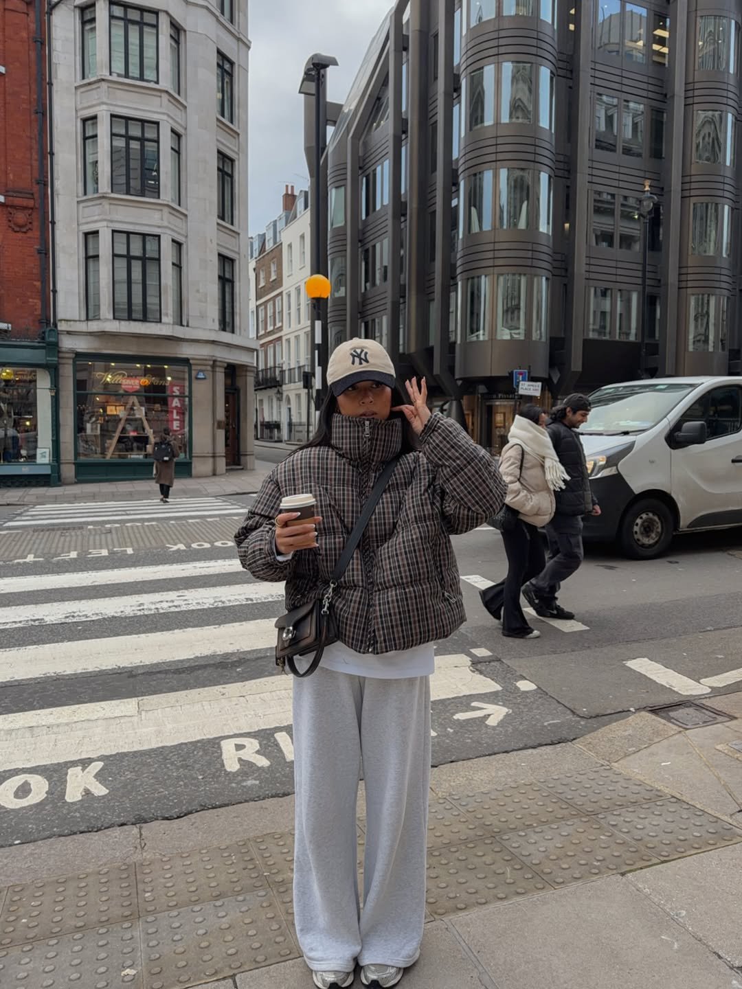 A plaid puffer layered over soft grey sweats brings texture to the city streets. The baseball cap peeking out and the crossbody bag add that downtown practicality, while the wide-leg hem keeps it modern.