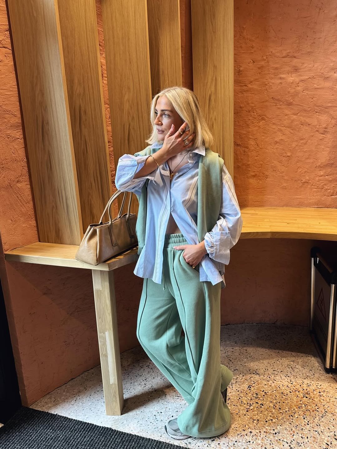Soft sage sweats paired with a crisp blue button-down feel like a masterclass in balance. The draped knit over the shoulders adds that quiet preppy touch, while the tailored handbag keeps everything refined against the warm wood backdrop.