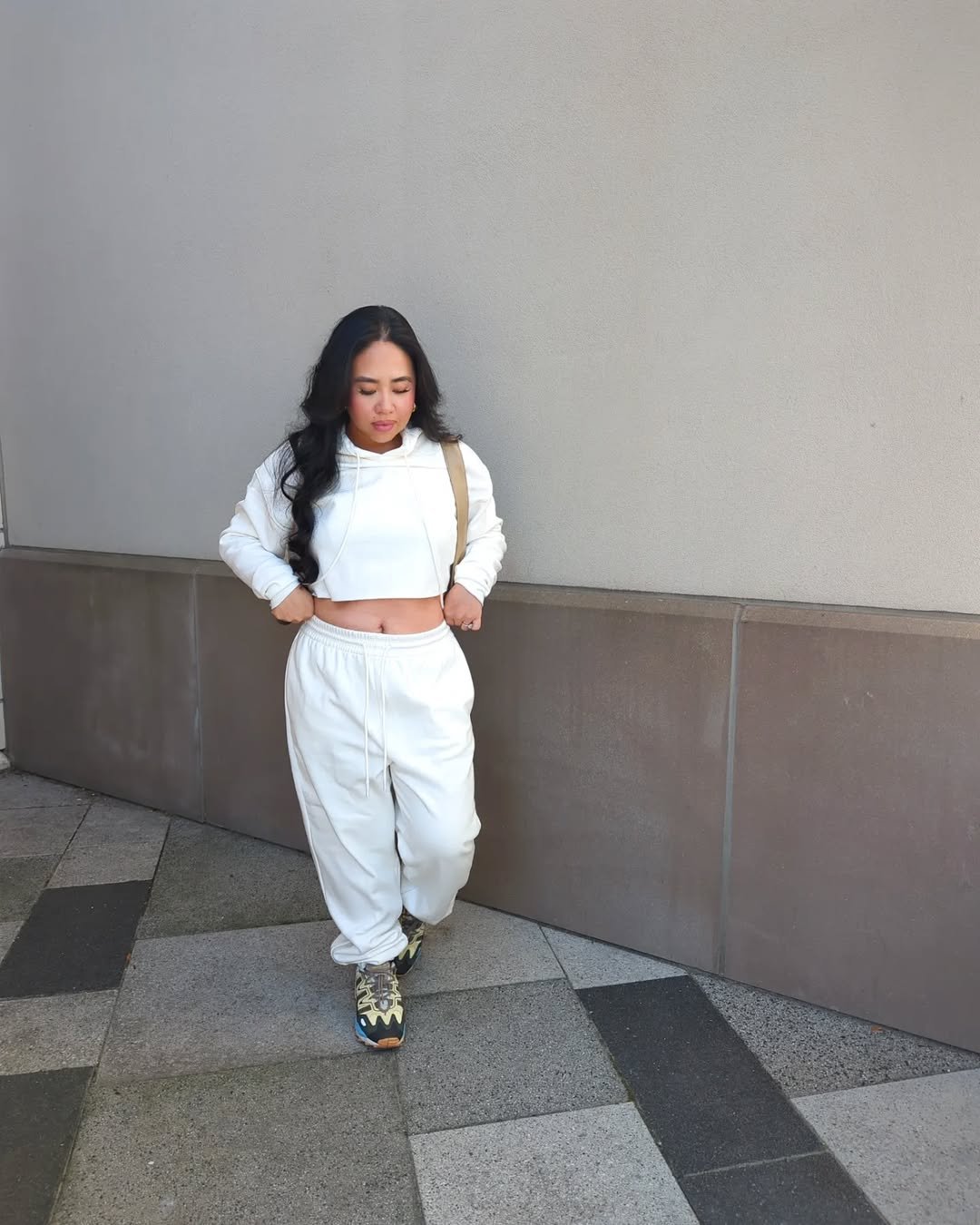 Head-to-toe cream always feels expensive, even in sweats. The cropped hoodie and relaxed joggers create that effortless high-low moment, especially paired with chunky sneakers and a simple shoulder bag.