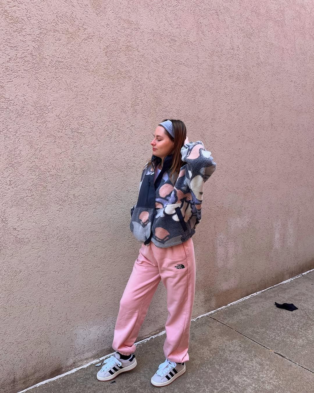 Blush sweatpants styled with a patterned fleece jacket create the sweetest contrast. The soft pink base feels gentle, while the textured top adds depth and interest without overpowering the palette.