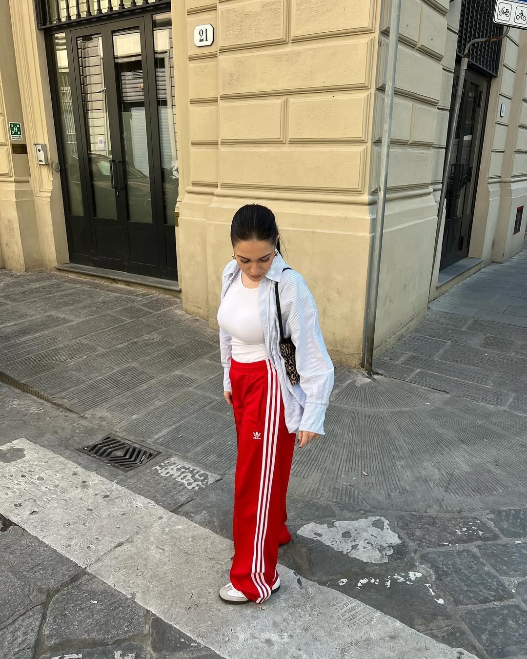 Red track pants with classic side stripes paired with a white tank and striped button-down feel fresh and city-ready. The structured crossbody adds just enough polish to keep the athletic base from feeling too literal.
