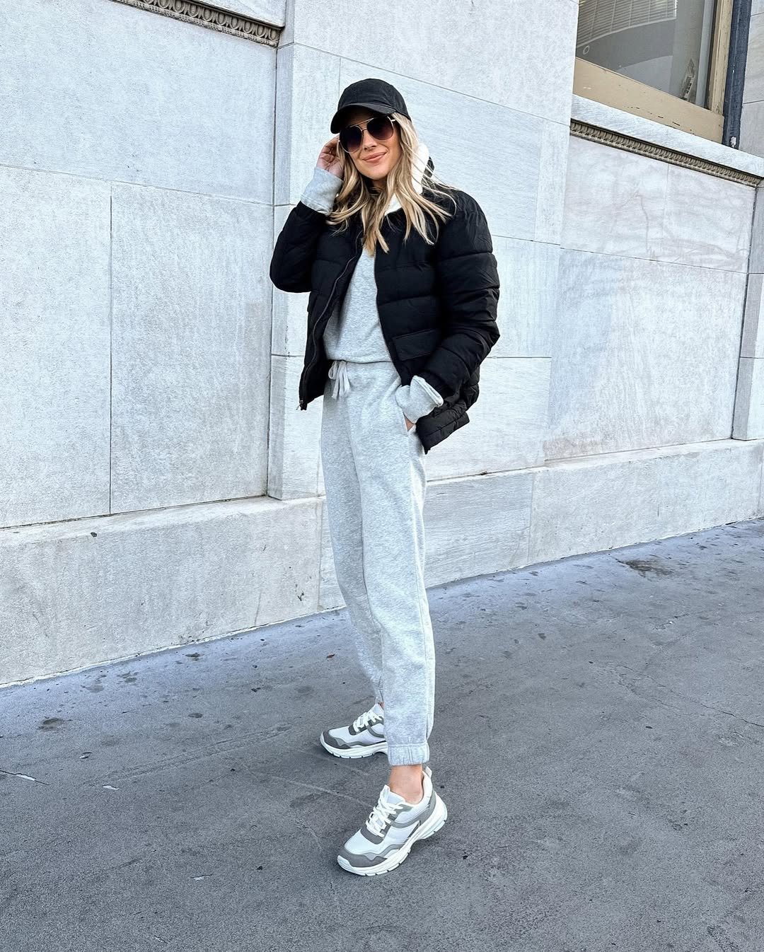 Grey joggers with a matching sweatshirt, topped with a black puffer and baseball cap. It’s clean, crisp, and ready for errands or airport days.