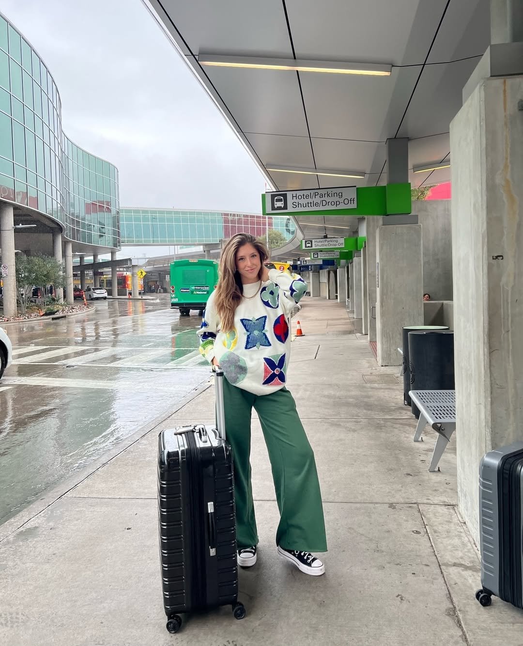 Green wide-leg sweats and a playful patterned sweater are the kind of airport outfit that actually sparks joy. The sneakers keep it practical, but the oversized knit adds personality against that rainy terminal backdrop.