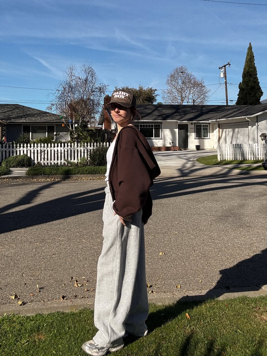 A brown hoodie, slouchy grey sweatpants, and a worn-in baseball cap under golden sunlight. It feels like a slow morning walk through a quiet neighborhood.