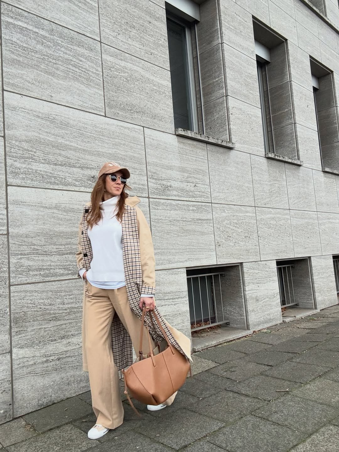 This outfit leans into those cozy camel tones that always feel right when trench season hits. A simple white sweater tucked into relaxed beige trousers creates a clean base, while the long coat adds movement as it drapes open while walking.