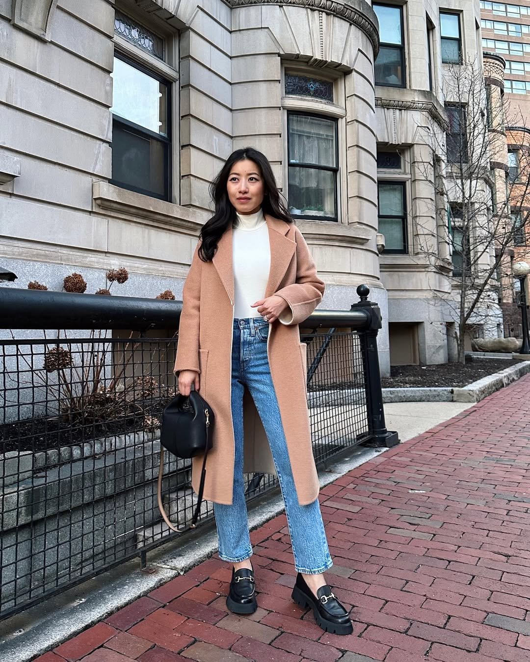 Camel coats have a way of making even the simplest outfit feel elevated. Here, the soft neutral outer layer pairs beautifully with a fitted turtleneck and classic blue denim.