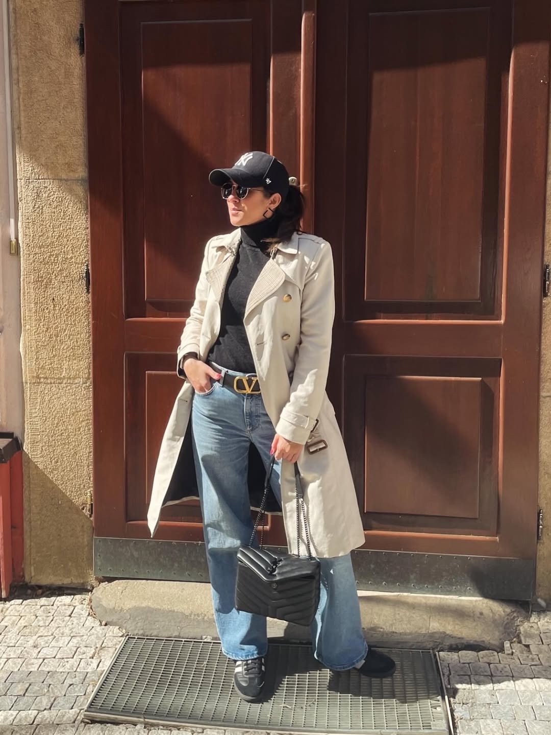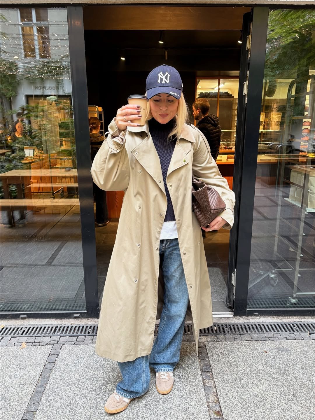 Here’s a perfect example of how relaxed pieces can still feel styled. A fitted black turtleneck and easy blue denim create a simple base, while the light trench adds just enough structure to pull everything together.
