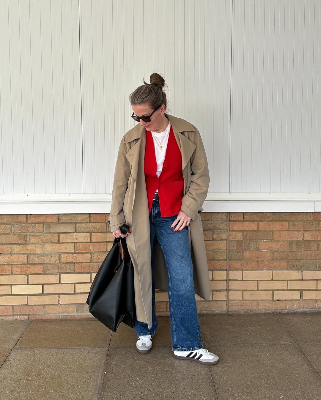 Sometimes the easiest way to wake up a classic trench coat is with a bold color moment underneath. Here, the bright red cardigan layered over a crisp white tee brings just enough energy to an otherwise relaxed denim look. The trench drapes effortlessly on top, balancing the playful color with that timeless, tailored feel.