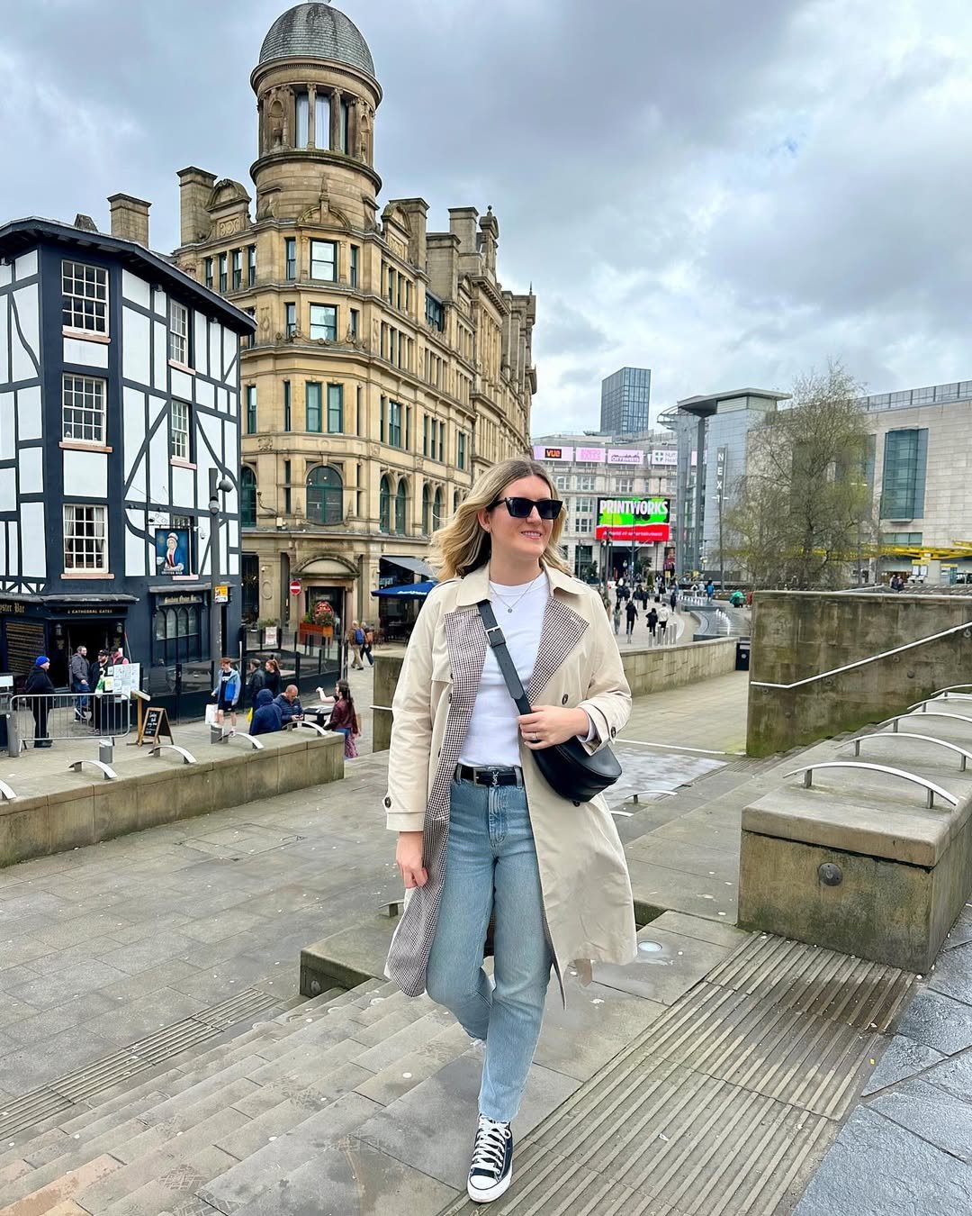 The black crossbody bag and Converse sneakers add a relaxed street-style touch that keeps the outfit grounded. It’s proof that a trench coat doesn’t have to feel overly polished, it can slide seamlessly into everyday outfits and still look chic.