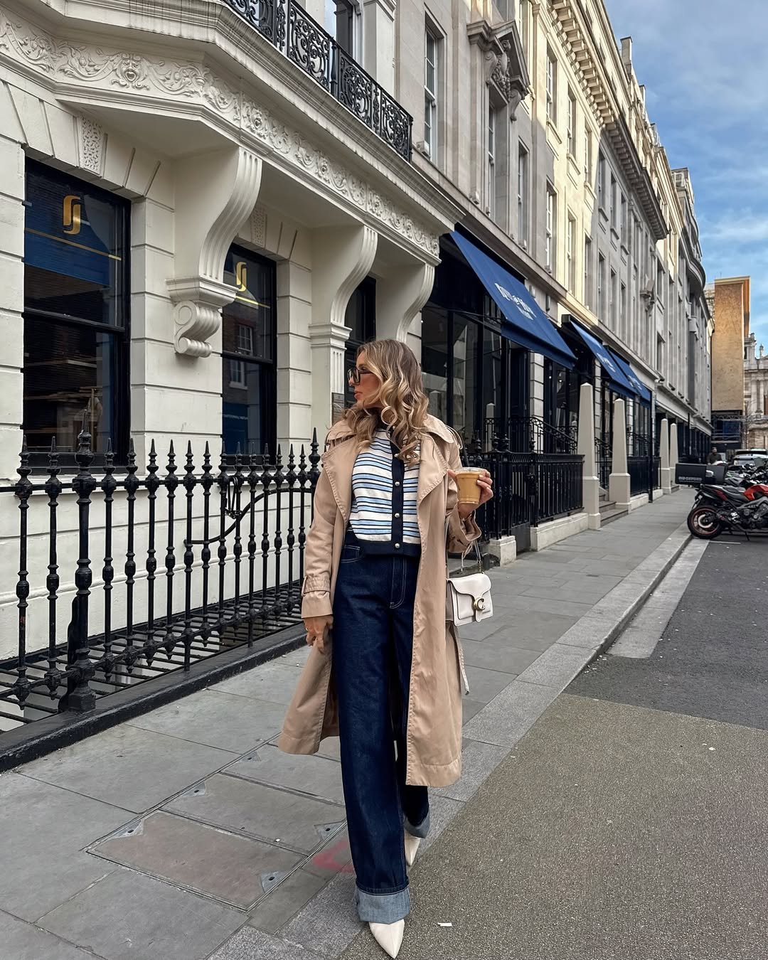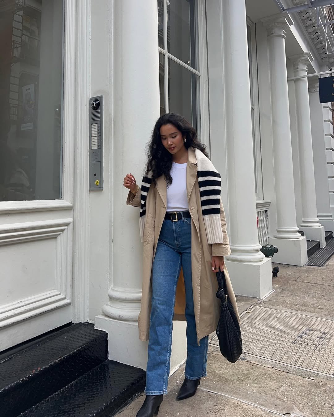 A timeless trench paired with straight-leg denim and a crisp white tee is one of those combinations that never loses its appeal. The striped sweater draped over the shoulders adds a touch of effortless layering.