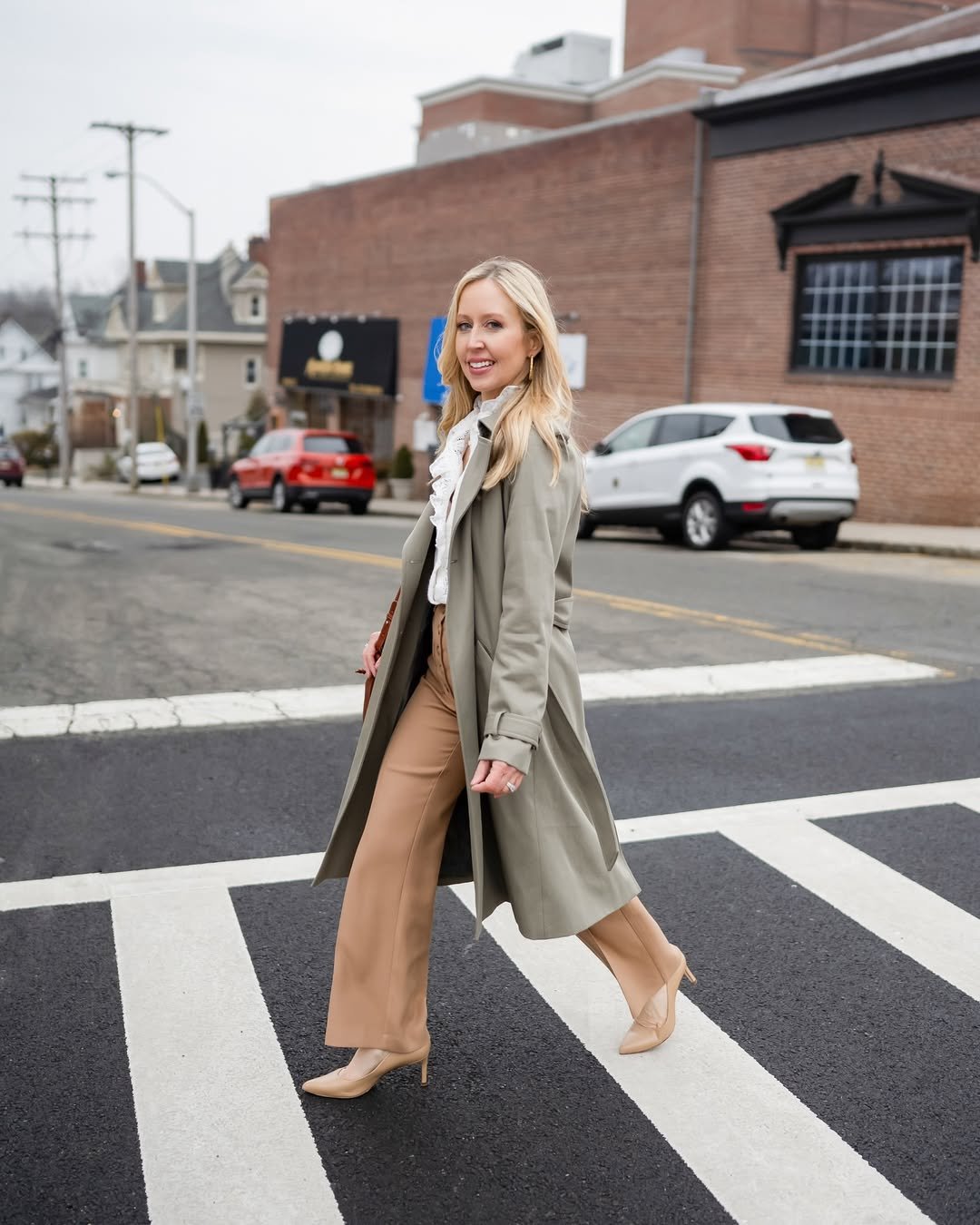 This outfit feels like a snapshot from a busy city morning. The olive trench coat flowing behind as she walks adds movement, while the soft neutral trousers and pointed heels keep the look polished.