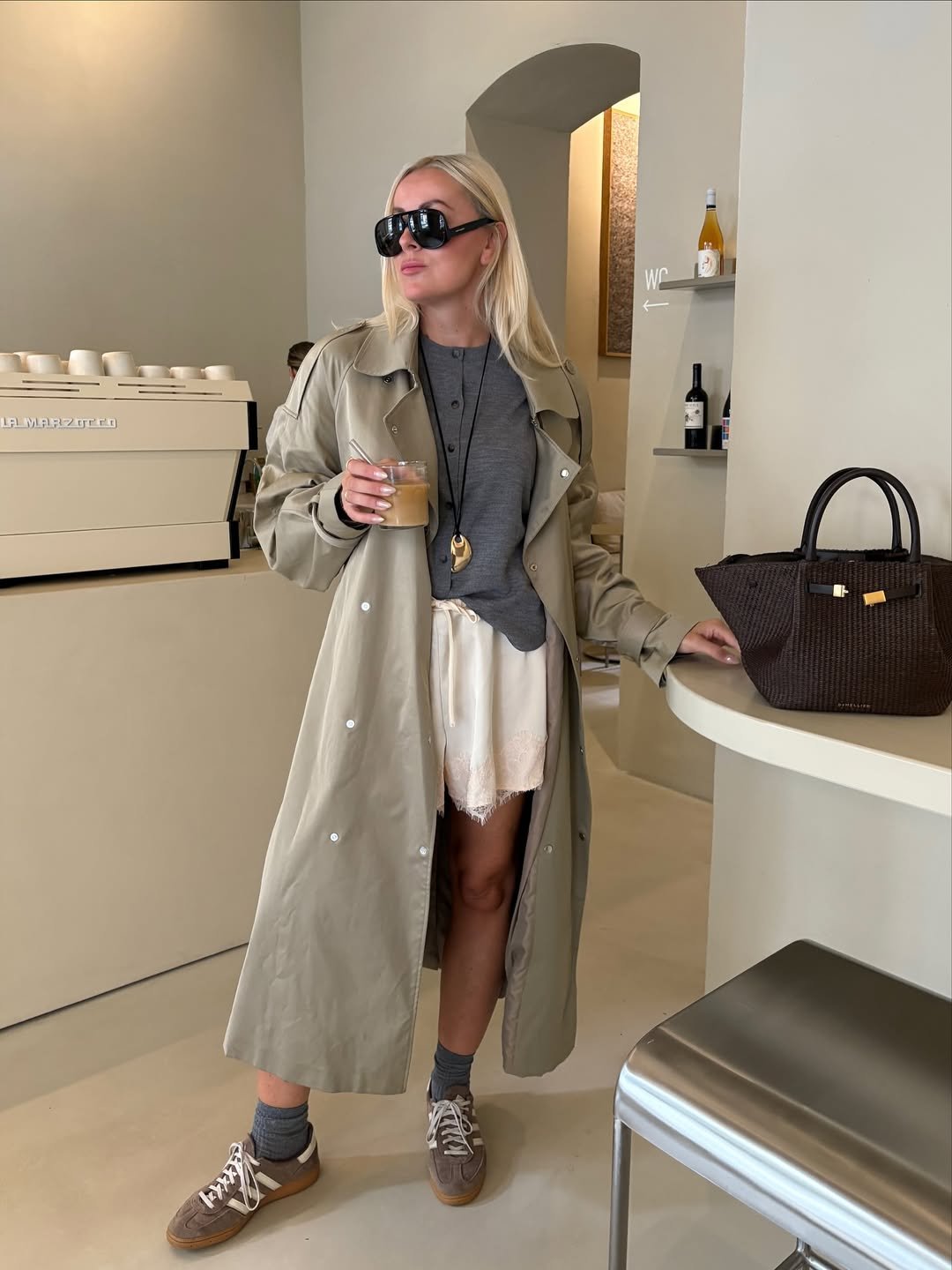 There’s something about soft neutrals in a cozy café setting that just works. The light trench layered over a relaxed grey top and delicate shorts feels effortless but intentional, like a quiet morning outfit that came together without overthinking it.