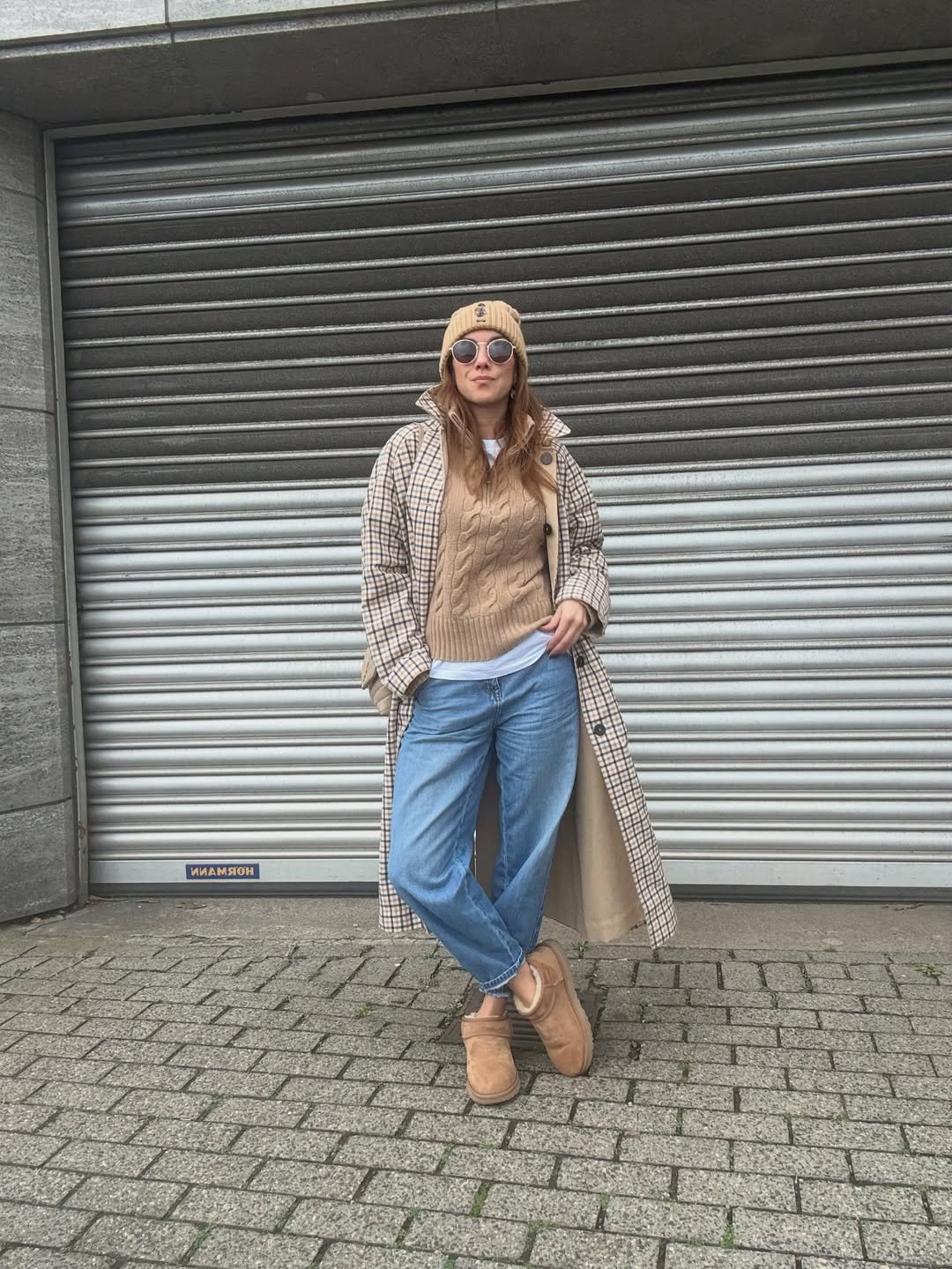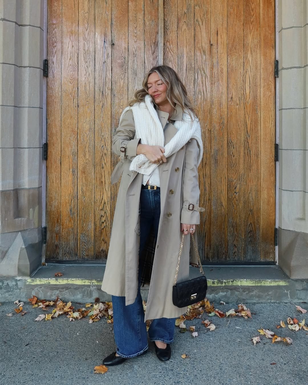 This look has that cozy weekend energy that’s hard not to love. A cable knit sweater layered under a classic check trench gives the outfit texture and warmth, while relaxed denim keeps everything feeling casual and approachable.