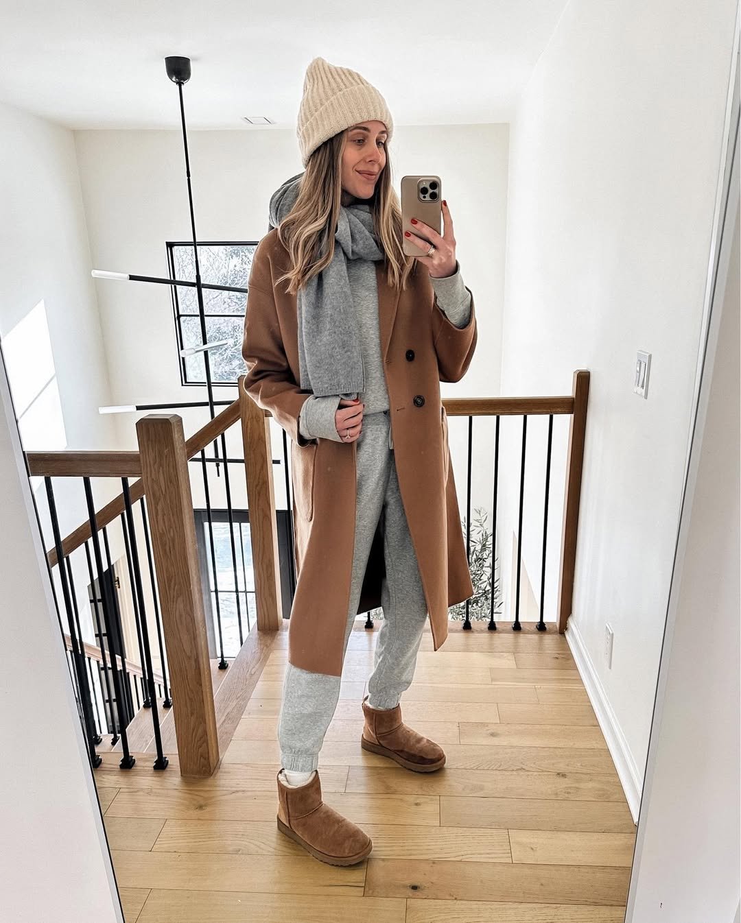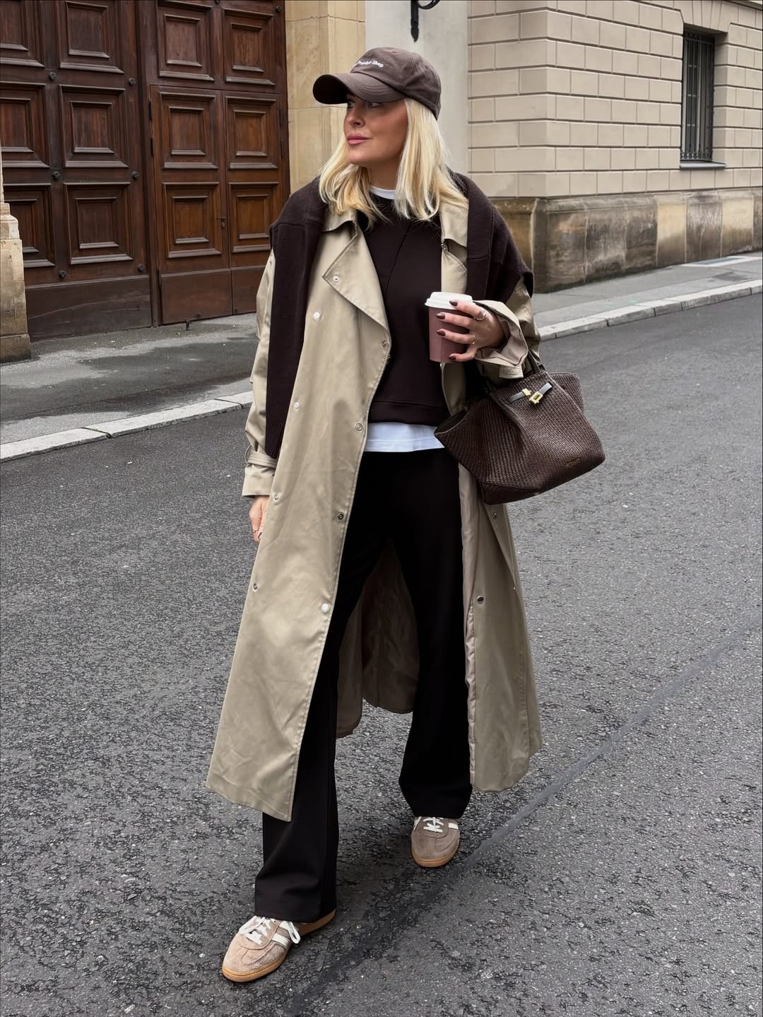 A trench coat can easily move into colder months with the right layers. Here, a soft grey sweatsuit creates a cozy base, while the rich brown coat adds warmth and structure to the relaxed silhouette.