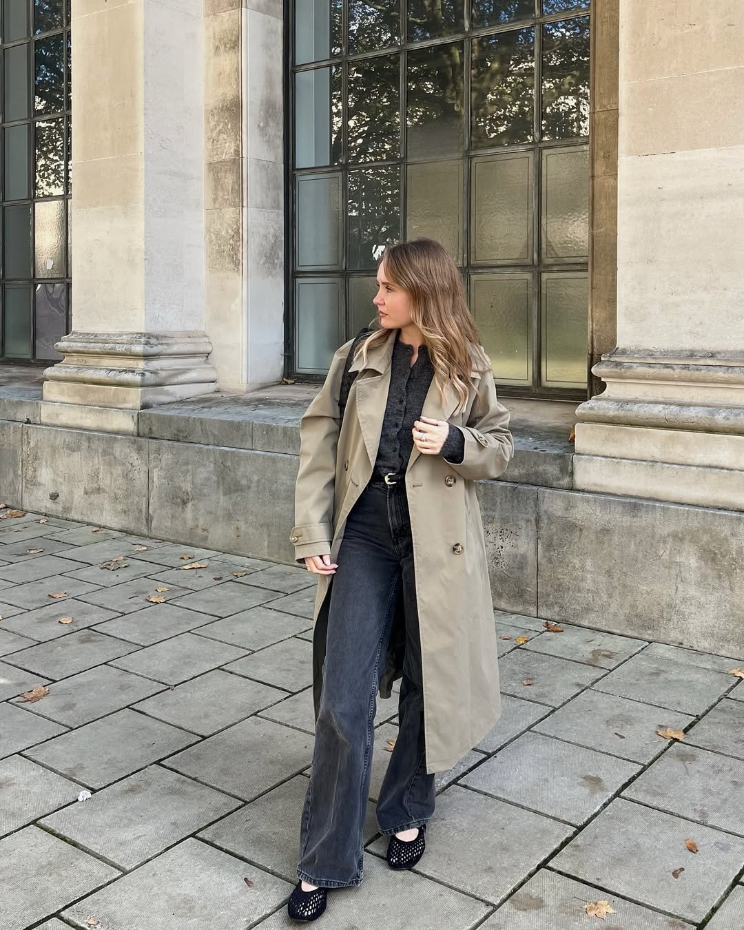 Black ankle boots and a structured bag bring the look together with a bit of polish. It’s relaxed, refined, and exactly the kind of outfit that makes a trench coat a true wardrobe staple.